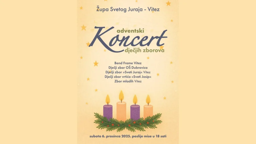 Župa Svetog Juraja – Vitez organizira Adventski koncert dječjih zborova koji će se održati u subotu, 6. prosinca 2025. godine, nakon mise u 18 sati. U programu će sudjelovati: