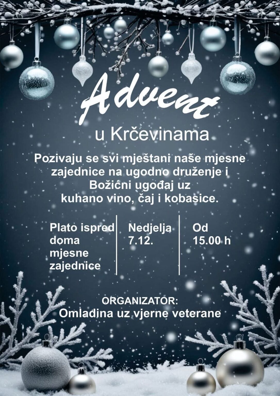 U Krčevinama će se ove nedjelje, 7. prosinca, održati adventsko druženje namijenjeno svim mještanima mjesne zajednice. Organizatori – Omladina uz vjerne veterane – pozivaju sve da dođu na plato ispred doma mjesne zajednice i uživaju u ugodnoj blagdanskoj atmosferi.