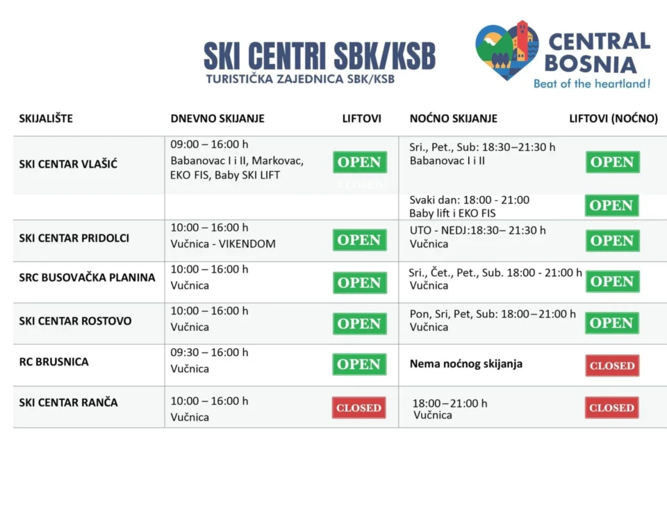 Turistička zajednica KSB objavila je najnovije informacije o radu ski-centara na području Kantona Središnja Bosna. Ljubiteljima zimskih sportova dostupno je dnevno i noćno skijanje na većini skijališta, uz napomenu da se stanje može mijenjati ovisno o vremenskim uvjetima.