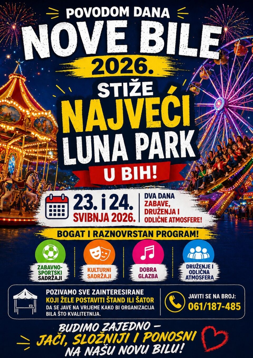 Povodom Dana Nove Bile 2026., koji će se održati 23. i 24. svibnja, Organizacijski odbor pripremio je sadržajan i raznovrstan program za sve generacije. Poseban naglasak stavljen je na dolazak jednog od najvećih luna parkova u Bosni i Hercegovini, koji će tijekom oba dana biti glavno mjesto zabave za djecu i odrasle.