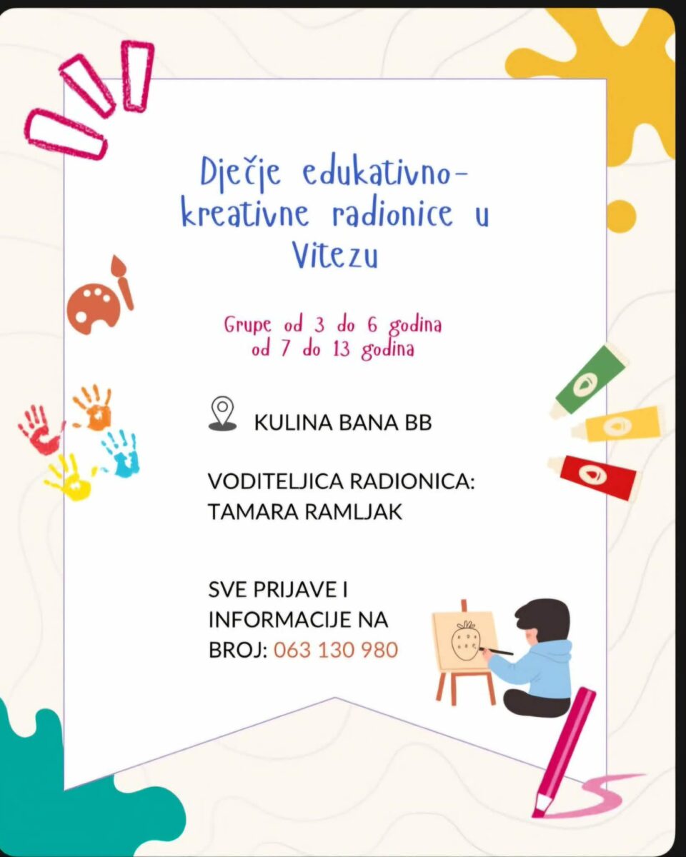Lokalne vijestiEdukativno – kreativne radionice u Vitezu by Uredništvo18/03/2026 0 Dragi roditelji, sa zadovoljstvom vas obavještavamo da otvaramo nove termine radionica za djecu u Vitezu. Voditeljica radionice: Tamara Ramljak Lokacija: Kulina bana bb, Vitez . Prijave i informacije na broj: 063/130-980 Vidimo se!