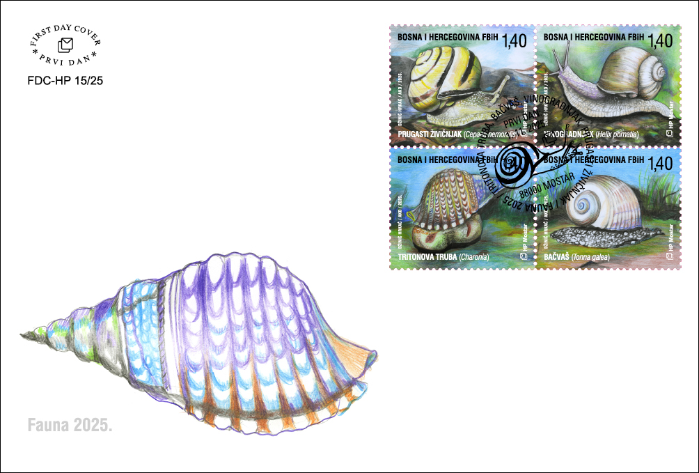 Magdalena Džinić Hrkać autorica je izdanja „Fauna 2025.“ koje sadrži četiri marke s motivima morskih i kopnenih puževa. Tritonova truba i puž bačvaš najveći su puževi u Jadranskom moru i spadaju u rijetke i zaštićene vrste. Ime tritonove trube veže se uz grčkog boga Tritona, sina boga mora Posejdona, koji je pušući u školjku kao u trubu uzdizao i smirivao valove. Puž bačvaš ima jednu rijetku karakteristiku – mogućnost luminescencije jer, kada se kreće vodom s potpuno raširenim stopalom, svijetli zelenkastom bojom. Vinogradnjak je jedan od najvećih kopnenih puževa, a prugasti živičnjak jedan je od najčešćih kopnenih puževa u Europi. Marke i prateći materijali mogu se kupiti u poštanskim uredima HP Mostar i