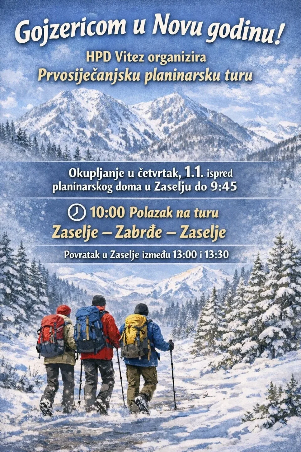 Okupljanje sudionika predviđeno je u četvrtak, 1. siječnja, ispred planinarskog doma u Zaselju, najkasnije do 9:45 sati, dok je polazak na turu u 10:00 sati. Planirana ruta vodi na relaciji Zaselje – Zabrđe – Zaselje, a povratak u Zaselje očekuje se između 13:00 i 13:30 sati.