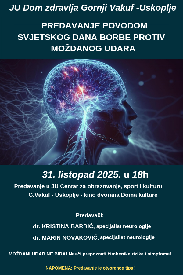 Večeras, 31. listopada 2025. godine, s početkom u 18:00 sati, u dvorani Doma kulture Gornji Vakuf – Uskoplje bit će održano preventivno predavanje na temu moždanog udara.