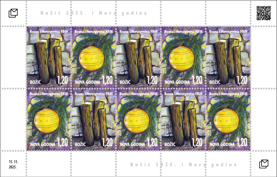 ukrašava raznobojnim staklenim kuglicama. Autorica likovnog rješenja je Božana Bošnjak, prvi dan izdanja 15. studenoga 2025. godine. Marke i prateći materijali mogu se kupiti u poštanskim uredima HP