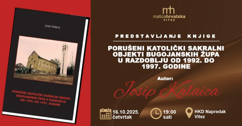 Nakon što je prije nekoliko mjeseci promocija knjige Josipa Kalaice izazvala veliku pozornost javnosti u Vitezu, Hrvatski dokumentacijski centar Domovinskog rata u BiH i Matica hrvatska Vitez pozivaju vas na predstavljanje nove knjige ovog autora pod naslovom „Porušeni katolički sakralni objekti bugojanskih župa u razdoblju od 1992. do 1997. godine“.