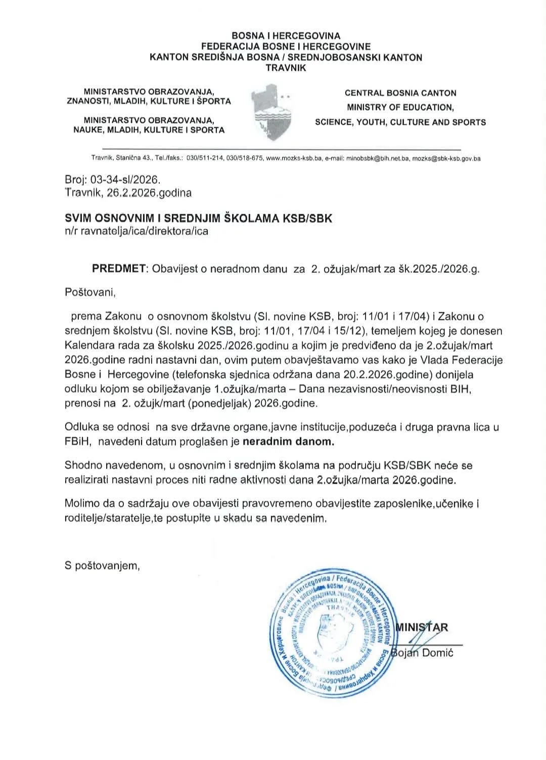 Kako se navodi u službenoj obavijesti, prema važećim zakonima o osnovnom i srednjem školstvu te Kalendaru rada za školsku 2025./2026. godinu, taj je datum prvobitno bio planiran kao redovan nastavni dan. Međutim, odlukom Vlade Federacije Bosne i Hercegovine obilježavanje 1. ožujka – Dana neovisnosti BiH, koji ove godine pada u nedjelju, preneseno je na ponedjeljak, 2. ožujka 2026. godine.