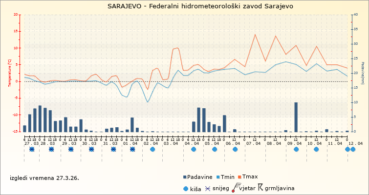 Jutarnje temperature zraka u Bosni kretat će se između 0°C i 5°C, dok će u Hercegovini biti od 4°C do 9°C. Dnevne temperature u Bosni iznosit će od 4°C do 9°C, a u Hercegovini od 9°C do 14°C.