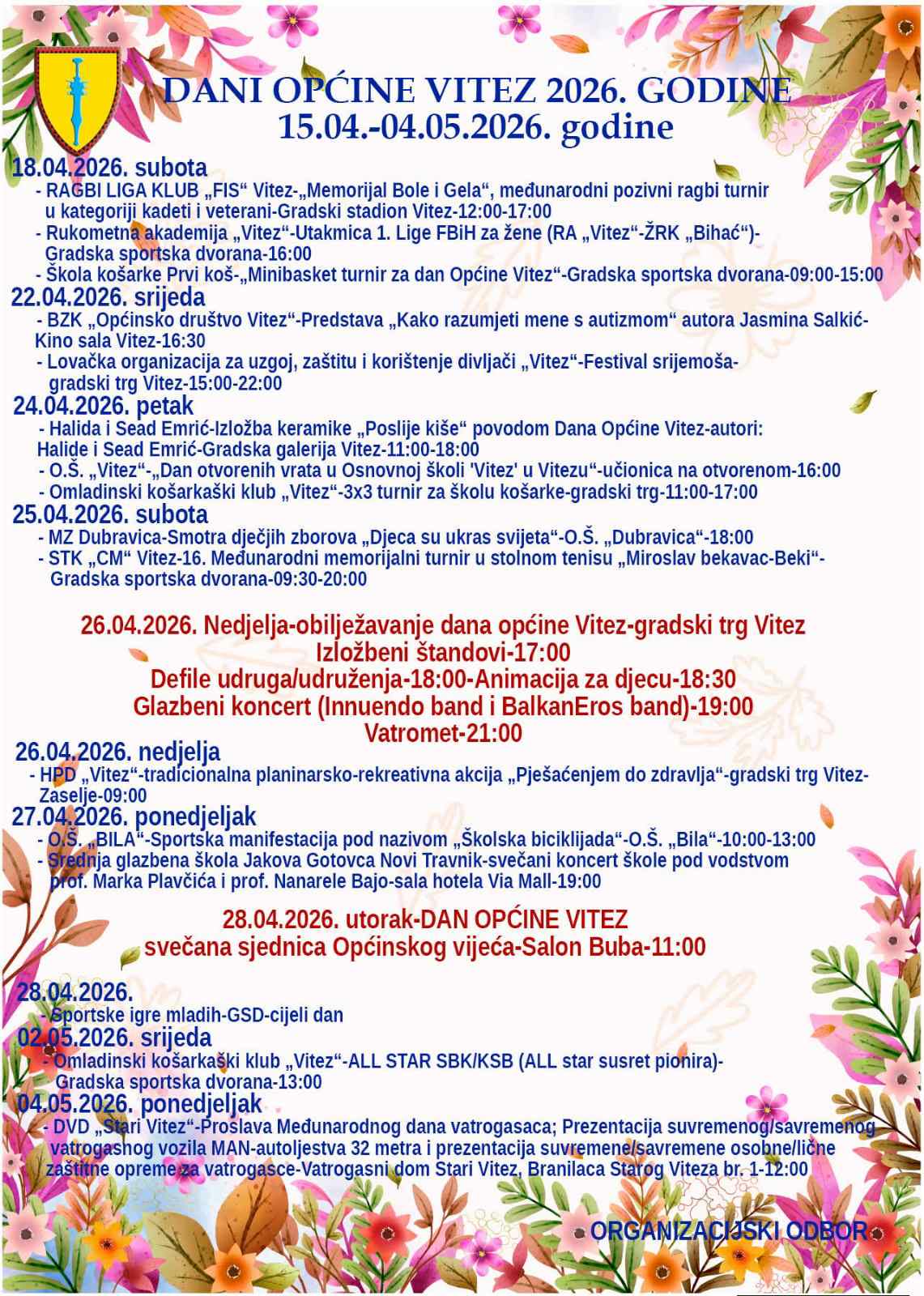 Manifestacija „Dani Općine Vitez 2026.“ donosi ove godine program koji će trajati od 15. travnja do 4. svibnja, okupljajući brojne kulturne, sportske i društvene događaje za sve generacije.