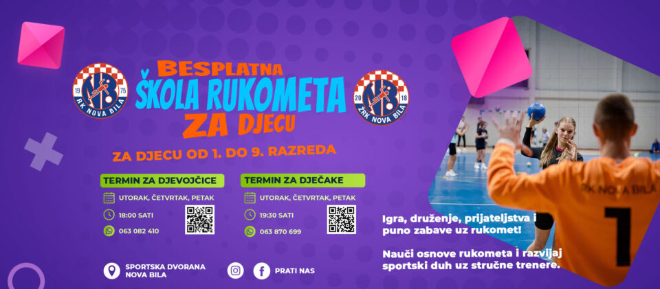 Škola rukometa otvorena je za djevojčice i dječake, bez obzira na prethodno iskustvo. Namijenjena je kako početnicima koji žele napraviti svoje prve rukometne korake, tako i djeci koja već imaju osnovna znanja i žele ih dodatno unaprijediti. Treninzi će se održavati u Sportskoj dvorani Nova Bila, pod vodstvom stručnih i licenciranih trenera.
