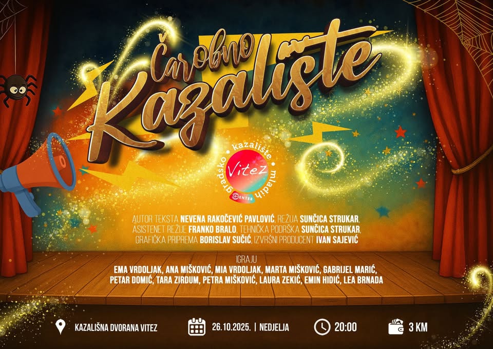 Ne propustite pogledati još jednu kazališnu čaroliju i avanturu u produkciji Gradskog kazališta mladih Vitez. U nedjelju, 26.10.2025.godine od 20 sati, dobro došli!