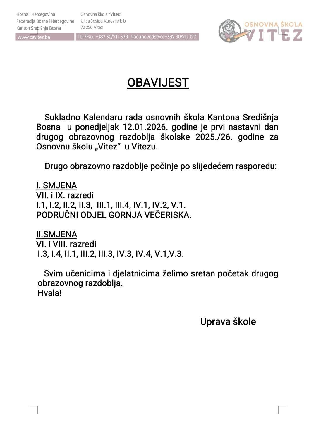 Sukladno Kalendaru rada osnovnih škola Kantona Središnja Bosna u ponedjeljak 12.1.2026. godine je prvi nastavni dan drugog obrazovnog razdoblja školske 2025./26. godine za Osnovnu školu „Vitez“ u Vitezu, navode iz Uprave ove škole.