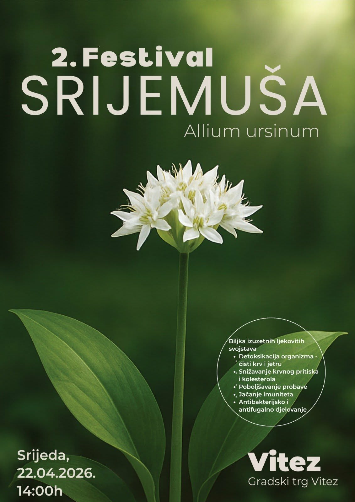 Festival srijemuša održat će se na gradskom trgu u Vitezu u srijedu, 22. 4. 2026., u poslijepodnevim satima, s početkom od 14.00h. Na taj dan ujedno se obilježava i Međunarodni dan planeta Zemlje. Posjetitelji će imati priliku okusiti tradicionalne delicije pripremljene s ovom zdravom biljkom i nazdraviti s domaćom rakijom prožetom mirisnom notom srijemuša te se družiti i slaviti prirodu i sve što nam ona nudi.