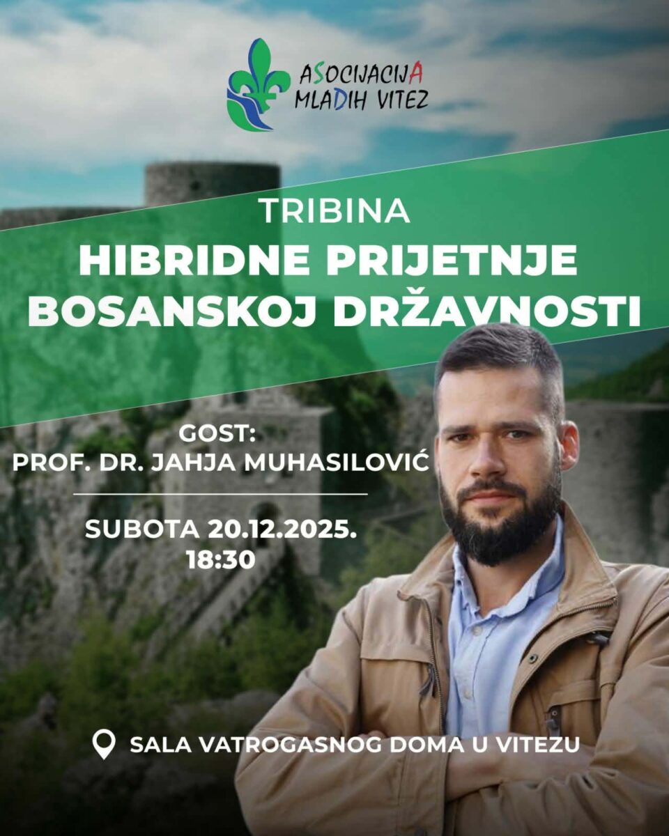 U organizaciji Asocijacije mladih Vitez, u subotu, 20. prosinca 2025. godine, s početkom u 18:30 sati, bit će održana tribina pod nazivom „Hibridne prijetnje bosanskoj državnosti“.