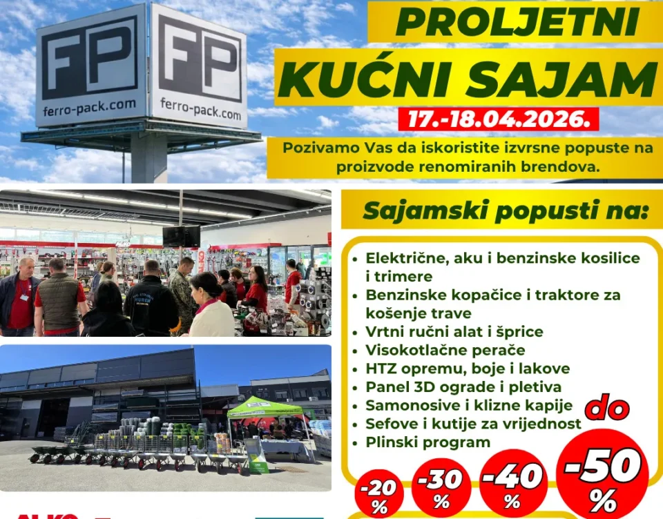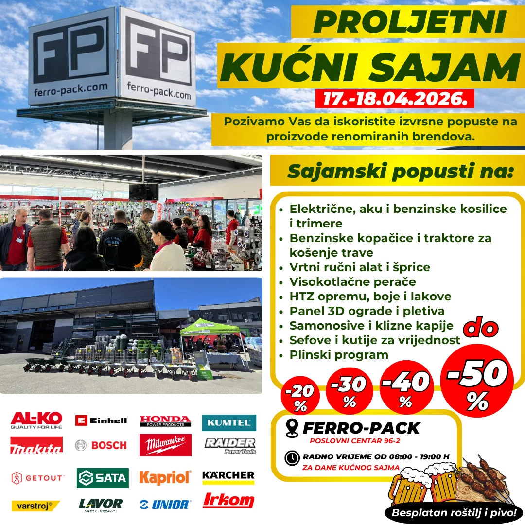 Pozivamo sve ljubitelje alata, vrta i doma da posjete proljetni kućni sajam koji će se održati 17. i 18. travnja 2026. u FERRO-PACK Poslovnom Centru (96-2).