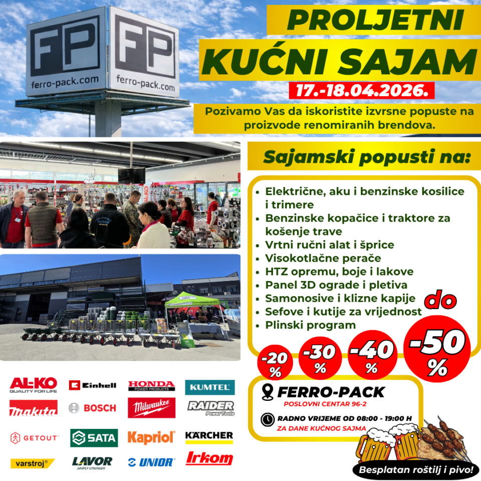 Iz Ferro-pack Vitez pozivaju sve ljubitelje alata, vrta i doma da posjete proljetni kućni sajam koji će se održati 17. i 18. travnja 2026. u FERRO-PACK Poslovnom Centru (96-2).
