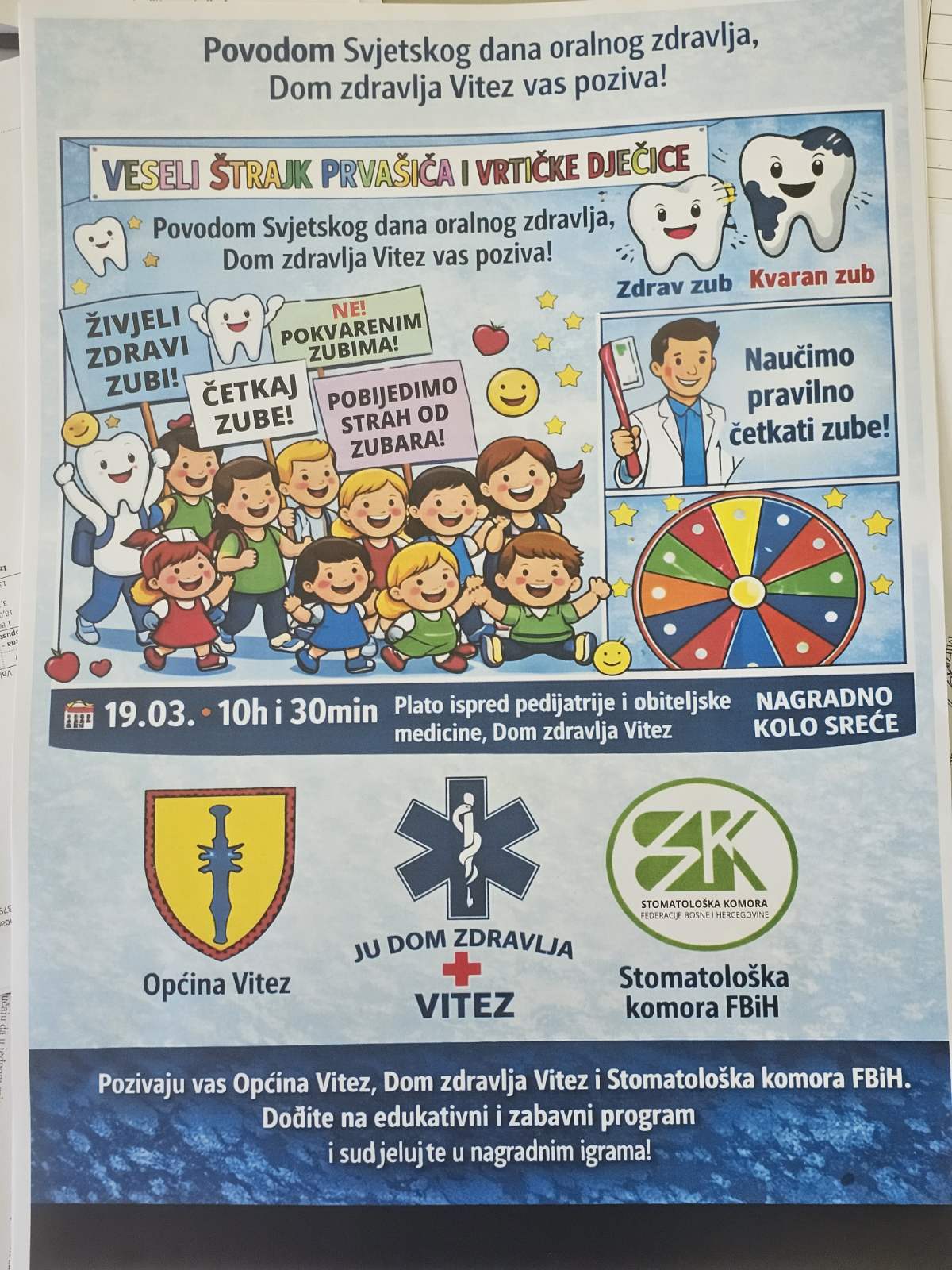 Povodom obilježavanja Svjetskog dana oralnog zdravlja, JU Dom zdravlja Vitez u suradnji sa Stomatološkom komorom Federacije Bosne i Hercegovine i Općinom Vitez organizira edukativno-zabavni događaj pod nazivom „Veseli štrajk prvašića i vrtićke dječice“.