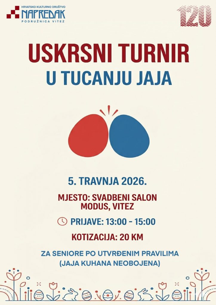 U nedjelju, 5. travnja 2026. godine, na dan najvećeg katoličkog blagdana Uskrsa, HKD Napredak podružnica Vitez suorganizira 25. (poslijeratno) tradicionalno natjecanje u tucanju jaja u salonu MODUS u Vitezu. Napredak je pokrovitelj ovog tradicionalnog natjecanja od samih početaka. Turnir će se održati u vremenu od 15,30 do 24,00 sati. Prijave takmičara se vrše u vremenu od 13,00 do 15,00 sati na sam dan održavanja turnira. Pozivaju se svi natjecatelji koji imaju tvrda jaja, da se prijave na ovo najveće natjecanje na općini Vitez, te da se svi zajedno družimo i tako uveličamo ovaj naš najveći blagdan.