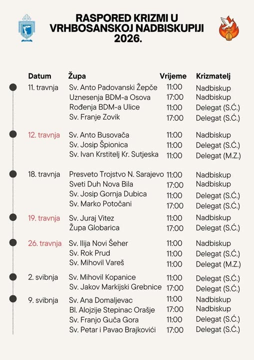 S tim u vezi, Krizma će se u Vitezu održati 19. 4. 2026. godine s početkom od 11:00 sati.
